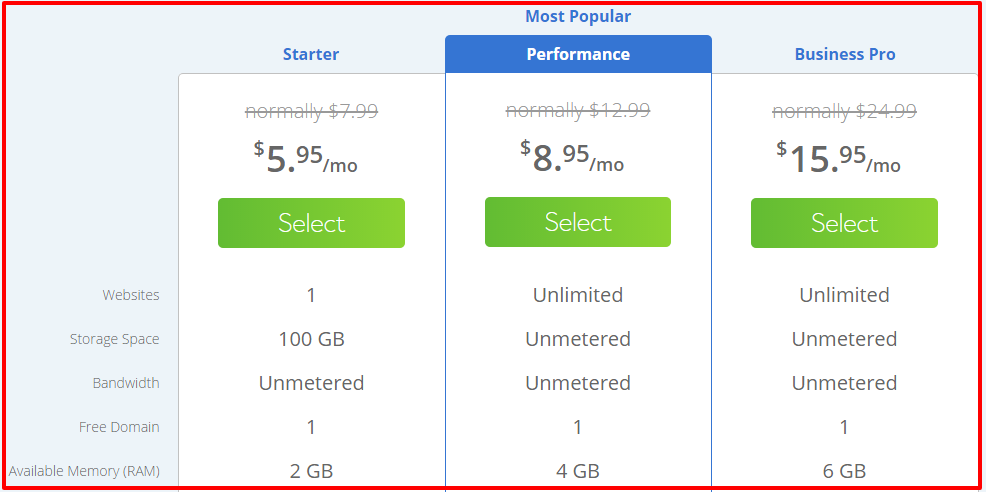 The above image shows the discounted pricing available on different Bluehost plans.