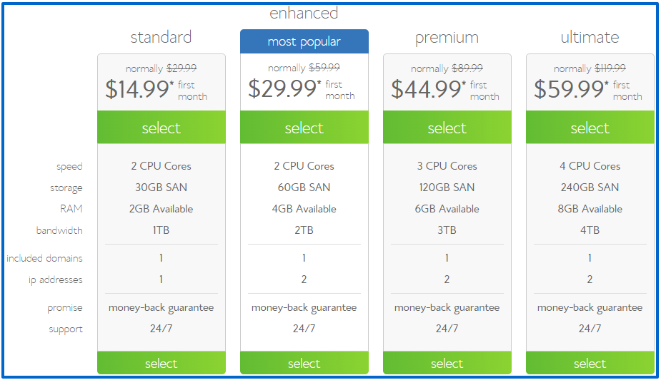 Bluehost offers 4 VPS hosting plans. You can save 50% on first month of your subscription using the below mentioned coupon link.